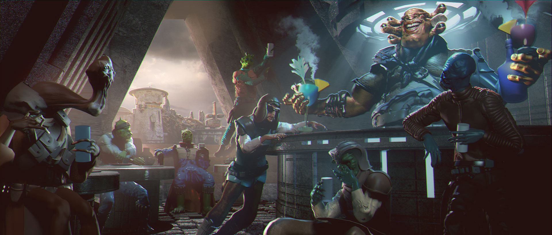 Deciding what the cantina music should sound like was a collaborative process that drew on inspiration from favorite tracks from other artists as well as the music currently playing in the park’s Oga’s Cantina. We created a music style guide that was consistent with other Star Wars cantina music but also left room for a modern, electronic flare. Secondly, the cantina music style evolved as I saw the early concept images that eventually took shape in the actual environmental spaces. After this process it was clear what I wanted to go after in terms of music that would fit both this area of the project and also into the greater Star Wars galaxy.